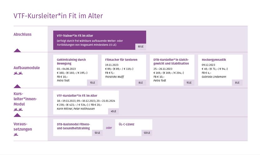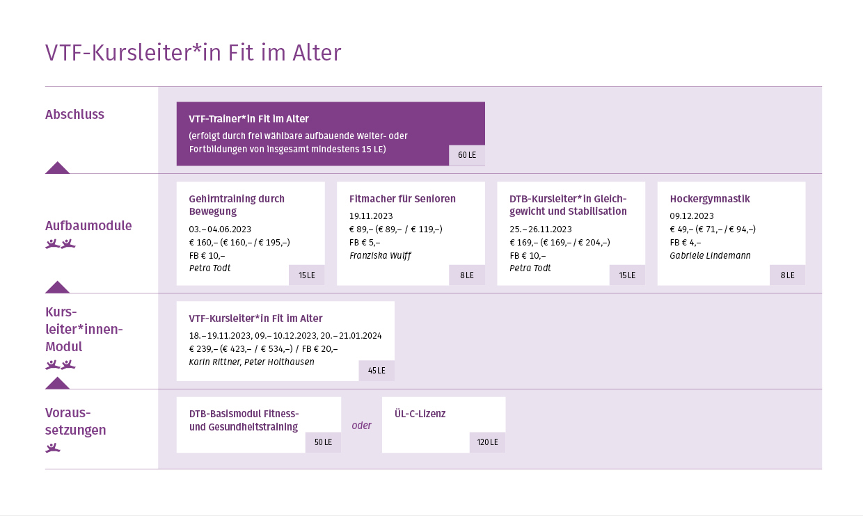 Der wachsende Anteil älterer Menschen in der Bevölkerung bildet sich auch in der Mitgliederstruktur der Sportvereine ab. Der VTF möchte dieser Entwicklung gerecht werden und mit dieser neuen Weiterbildung sowie möglichen Aufbaumodulen qualifizierte Kursleiter*innen und Trainer*innen ausbilden, die alltagsbezogene und zielgruppengerechte Bewegungsstunden für Menschen im fortgeschrittenen Lebensalter durchführen können. Die Fähigkeiten und die Leistungsfähigkeit dieser Teilnehmer*innen sollen gefördert sowie zwischen verschiedenen Altersgruppen unterschieden werden. Das fröhliche Miteinander, die differenzierte Herangehensweise an individuelle Voraussetzungen, Abwechslung, adäquate und motivierende Inhalte sowie die individuelle Ansprache spielen hier eine besondere Rolle. Die Teilnehmer*innen der Fortbildung sollen in diesem Kurs Kompetenzen zum Umgang mit älteren Menschen im Sport erhalten, auch um eigene Kursformate zu entwickeln.