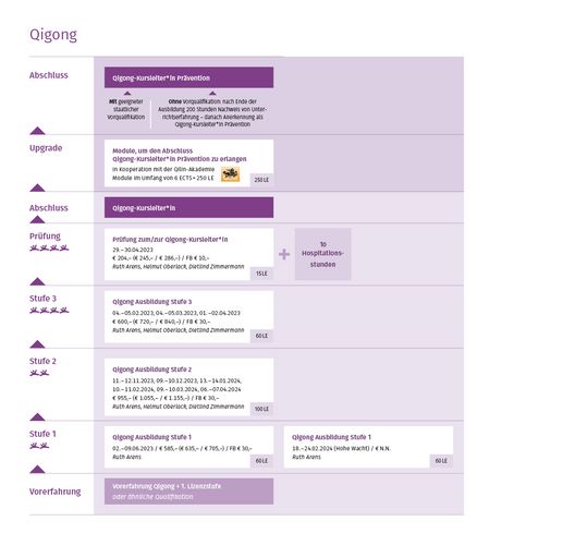 Die VTF-Qigong-Ausbildung besteht aus einer Einstiegs-Stufe I mit der Vermittlung der theoretischen und praktischen Grundlagen des Qigong (60 LE), einer längeren Stufe II zur Vertiefung von Theorie und Praxis (100 LE), einer Stufe III mit dem Schwerpunkt Qigongpädagogik (60 LE), 10 Hospitationsstunden und einer anschließenden Prüfung zum/zur Qigong-Kursleiter*in (20 LE). Nach erfolgreich abgeschlossener Prüfung erhalten Sie das Zertifikat „Qigong-Kursleiter*in“. Mit diesem Zertifikat können Sie in Sportvereinen Qigong mit dem Qualitätssiegel Pluspunkt unterrichten.