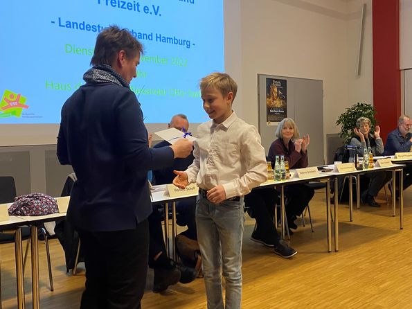 Für seine bereits jetzt schon großen sportlichen Erfolge erhielt der 12-jährige Jonas Elias Kirsch als Mitglied im Bundeskader im Gerätturnen männlich (HNT) eine besondere Anerkennung beim VTF-Verbandstag am 22. November 2022 vom VTF-Vorstand und dem Verbandsrat (vertreten durch Maren Gebauer). Zudem wurde sein Trainer Dr. Edwin Palnau (Altonaer TSV) mit einer besonderen Ehrung für sein außerordentliches langjähriges Engagement überrascht. Die Ehrennadel überreichte Dr. Christian Frenzel, Sprecher der Landesturnverbände im DTB Präsidium.