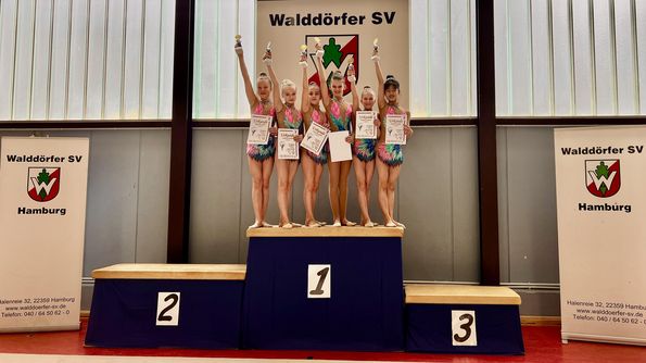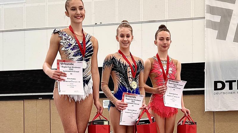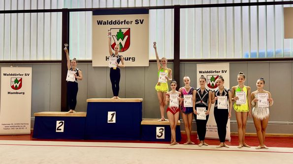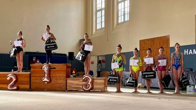 Hamburger Gymnastinnen des SV Grün Weiß Eimsbüttel, des Walddörfer SV und des HSV Barmbek Uhlenhorst zeigten großartige Leistungen beim Deutschland Cup am 24./25. Juni 2022 in Frankfurt. Gold ging an die Gruppe der 11-15-jährigen Walddörfer Gymnastinnen, die in ihrer Altersklasse sieben startende Gruppen mit zwei grandiosen Übungen hinter sich ließen. Gleich mehrfach auf dem Treppchen landete in der K10 Anna Forchner (ebenfalls Walddörfer SV) mit einem 3. Platz in der Gesamtwertung, Platz 2 mit dem Seil und Platz 3 mit dem Ball. In der K8 gewann Lilly Schartner von Grün Weiß Eimsbüttel mit ihrer Bandübung und dem Ball. Ihre Teamkollegin Ksenja Schulkin erturnte sich in der Gesamtwertung und mit dem Ball jeweils den zweiten Platz. Alina Levitskaya (Walddörfer SV) freut sich in der Altersklasse 25+ über den 3. Platz in der Gesamtwertung und den 2. Platz mit dem Seil. Viele weitere Hamburger Gymastinnen erreichten hervorragende Platzierungen.