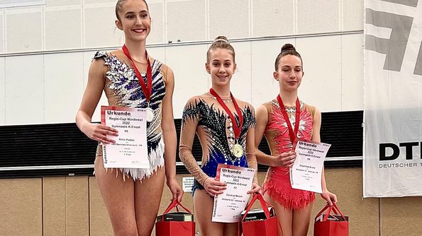... Das Niveau in dieser Altersklasse ist besonders hoch. Unschlagbar zeigt sich Ksenja Schulkin von GWE mit zwei wirklich tollen Übungen mit dem Ball und dem Band und steht am Ende des Wettkampfes glücklich ganz oben auf dem Treppchen, dicht gefolgt von ihren beiden Vereinskolleginnen Lilly Schartner und Polina Starikova auf den Plätzen 2 und 3. Am Ende freuen sich 7 Gymnastinnen (Ksenia Schulkin, Lilly Schartner, Polina Starikova, Jolina Repky, Mia Sophie Ille, Melike Erdagi und Claudia Robbin Blick Prada) über die erreichte Qualifikation.