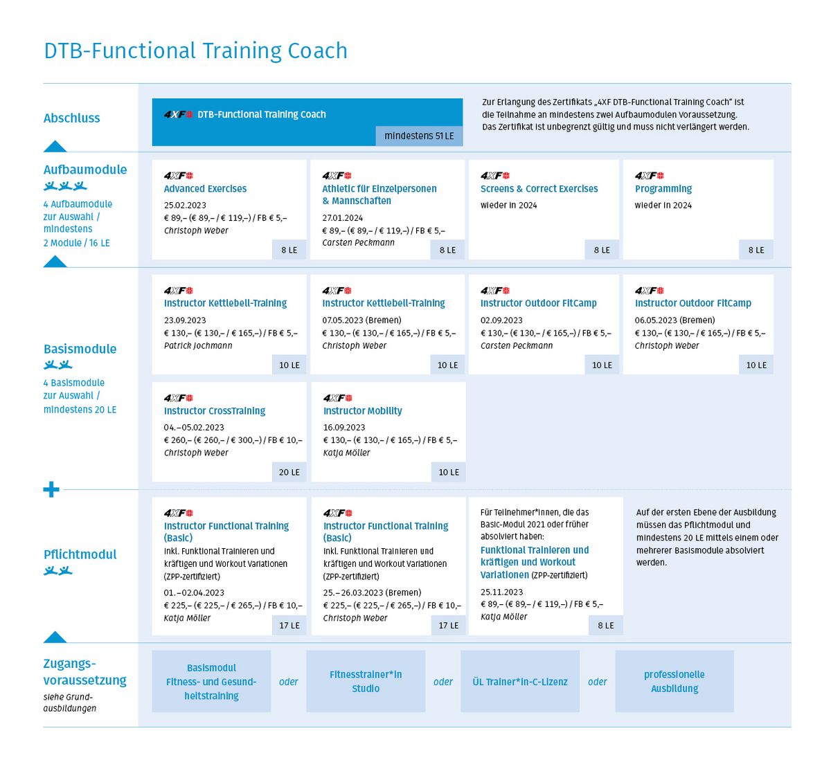Der DTB-Functional Training Coach ist eine modulare Zertifikats-Ausbildung und setzt sich aus Basismodulen und Aufbaumodulen zusammen. Die Ausbildung befähigt Trainer*innen, in unterschiedlichen Bereichen des vielfältigen und umfangreichen Handlungsfeldes Functional Training tätig zu werden.