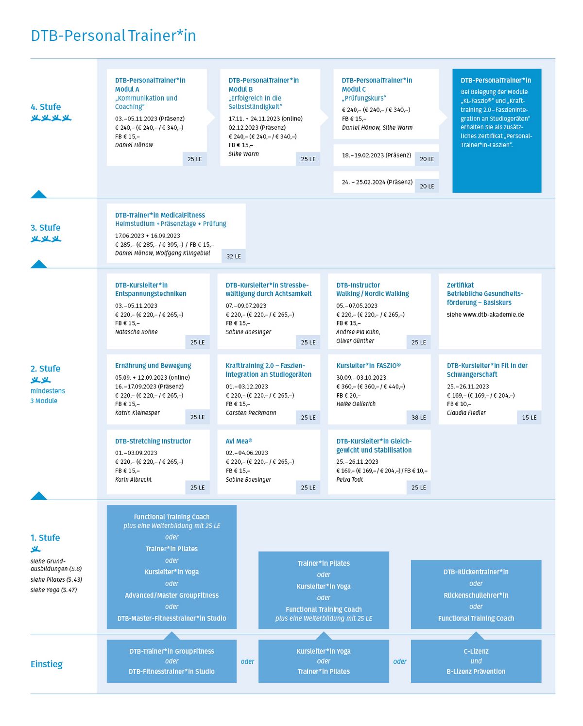 Diese Ausbildung orientiert sich an den aktuellen Anforderungen des Fitnessmarktes und bereitet Sie auf ein spannendes, zukunftsorientiertes Berufsfeld vor. Das Tätigkeitsfeld ist vielfältig. Um die Individualität des Personal Trainers abzubilden, wurden die Zugangswege zur Ausbildung zum/zur DTB-PersonalTrainer*in verändert. Im Schaubild finden Sie die detaillierten Anforderungsprofile.
