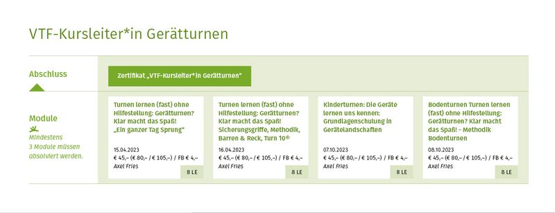Als VTF-Kursleiter*in Gerätturnen zeichnen Sie sich durch Ihre Kompetenz und Ihr aktuelles Know-how im Gerätturnen mit Kindern aus. Die einzelnen Fortbildungen sind auch ohne C-Lizenz buchbar.