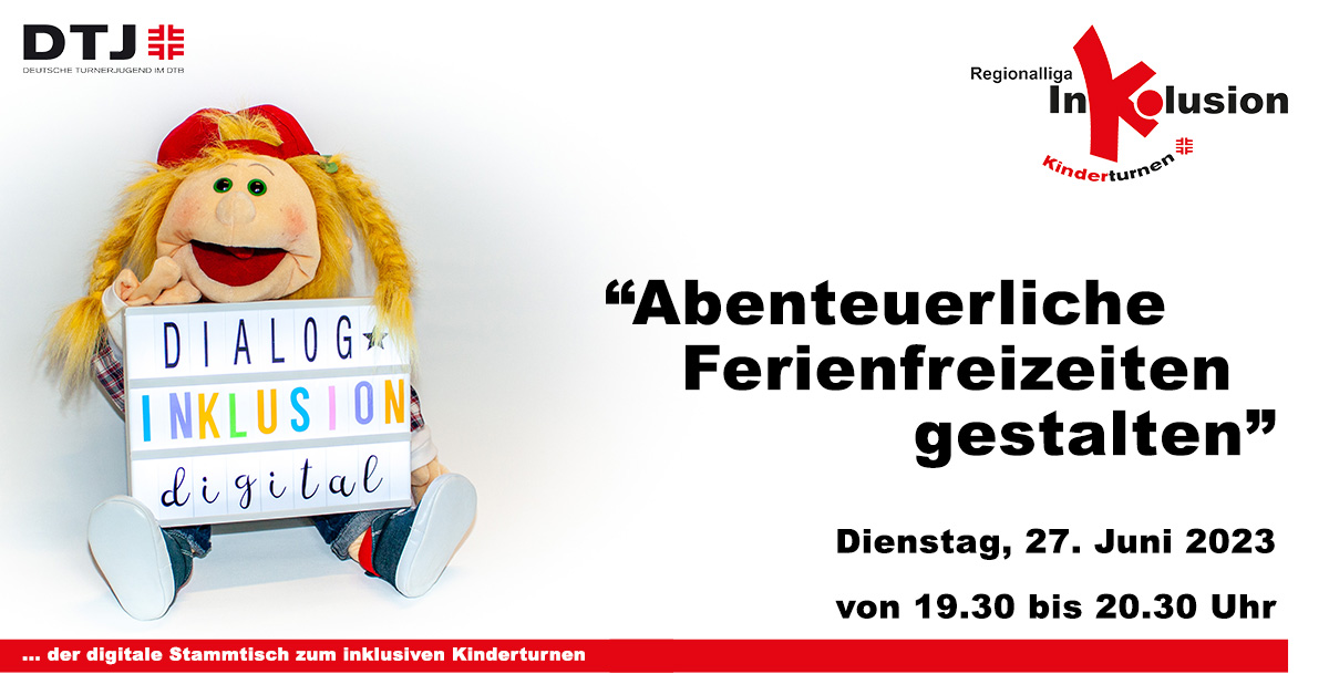 im Auftrag der Deutschen Turnerjugend möchte ich Euch herzlich zum "Dialog.INKLUSION - der digitale Stammtisch zum inklusiven Kinderturnen" am Dienstag, 27. Juni 2023 um 19.30 Uhr einladen.
