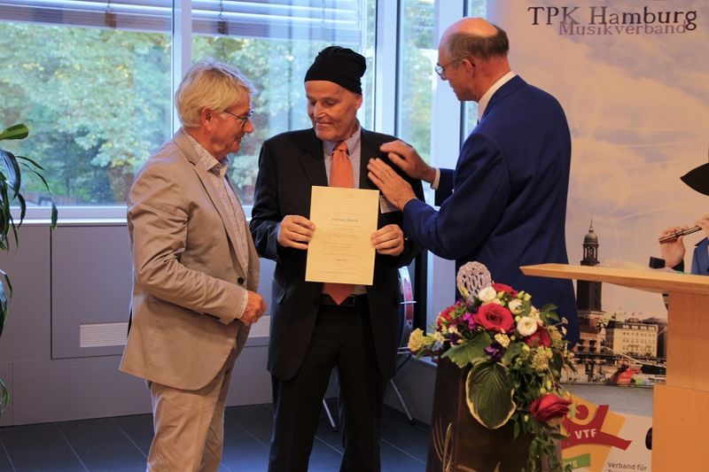 Eine besondere Ehrung wurde Peter Dwinger (2. Vorsitzender der TPK Hamburg e.V.) zuteil. Mit dem „Ehrenbrief des DTB“ bedankte sich Paul-Gerhard Wienberg-Schaper (VTF-Ehrenvorsitzender und DTB- Ehrenmitglied) für den unermüdlichen Einsatz rund um die Musik und sein ehrenamtliches Engagement im Bereich „Finanzen“ im VTF.