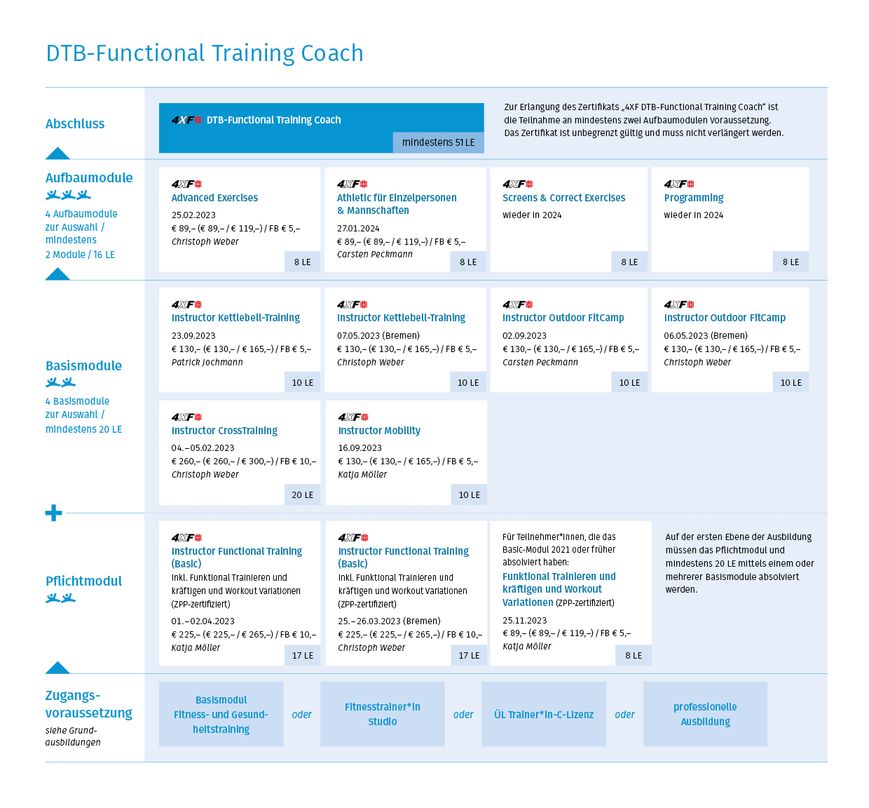 Der DTB-Functional Training Coach ist eine modulare Zertifikats-Ausbildung und setzt sich aus Basismodulen und Aufbaumodulen zusammen. Die Ausbildung befähigt Trainer*innen, in unterschiedlichen Bereichen des vielfältigen und umfangreichen Handlungsfeldes Functional Training tätig zu werden.